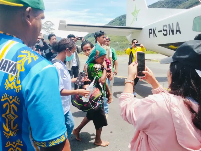 Puncak, Papua Tengah – Aparat keamanan bersama tenaga medis menevakuasi anak berusia 6 tahun, warga asal Distrik Sinak, Kabupaten Puncak, Provinsi Papua Tengah. Evakuasi anak perempuan yang menjadi korban dari aksi kekerasan kelompok bersenjata dilakukan pada Sabtu, 18 April 2026, pukul 11.28 hingga 11.50 WIT di Bandara Mulia, Distrik Muara, Kabupaten Puncak Jaya, menggunakan pesawat Smart Aviation PK-SNA dengan tujuan Bandara Douw Aturure, Nabire.